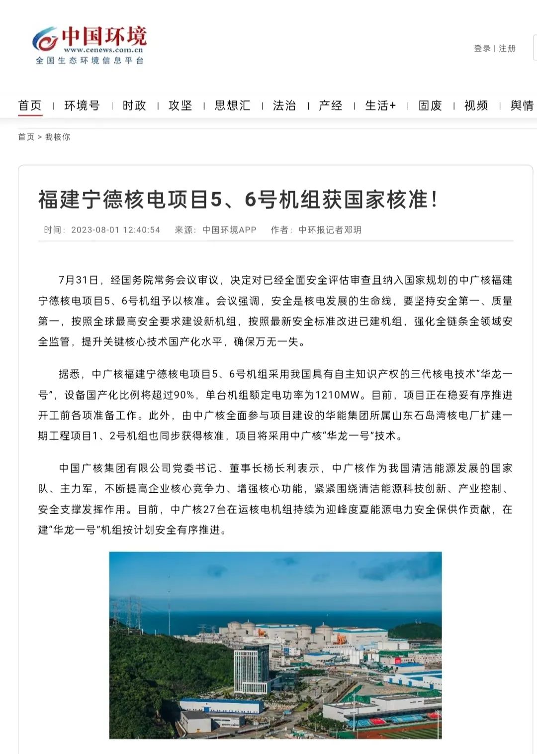 央視新聞頻道以《“華龍一號”加速批量化建設》為題,聚焦報道寧德核電站5、6號機組獲批,中廣核“華龍一號”批量化建設穩步推進等情況。