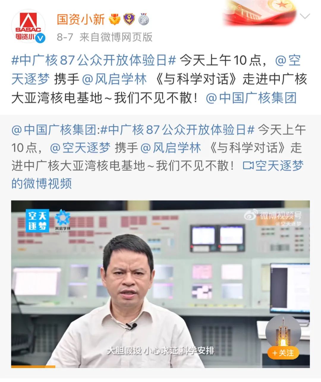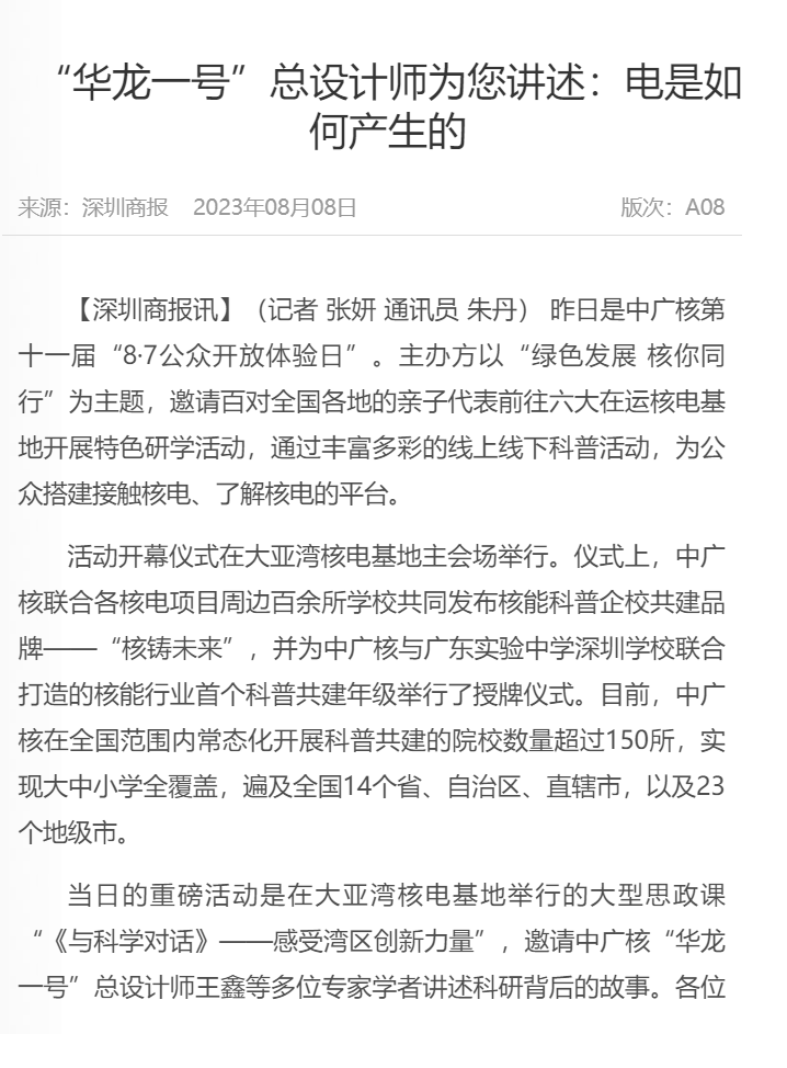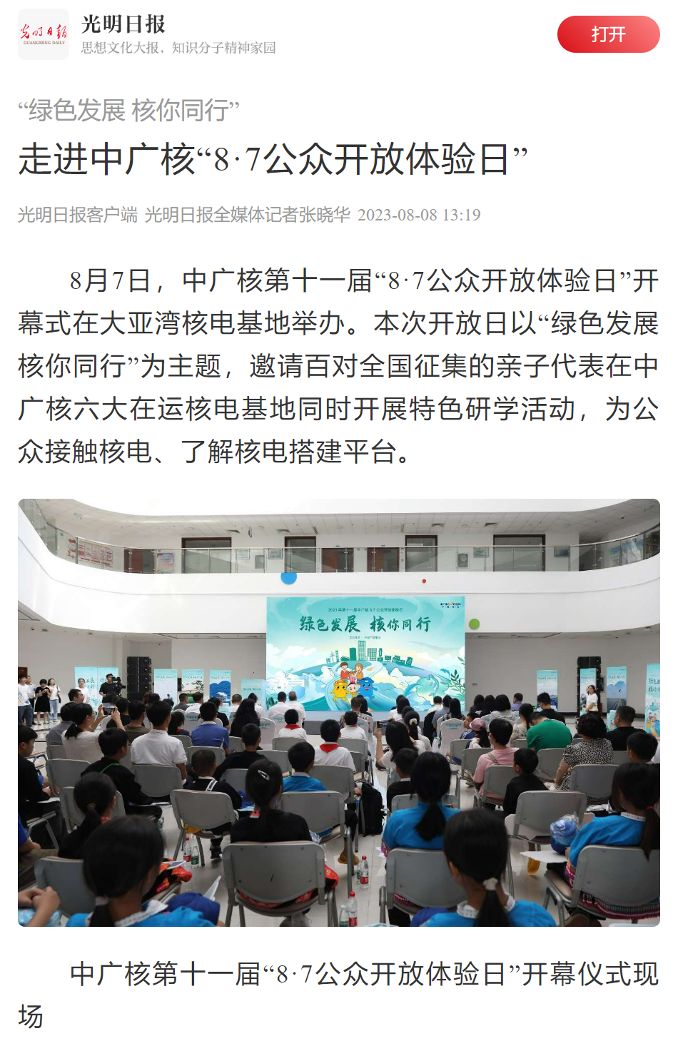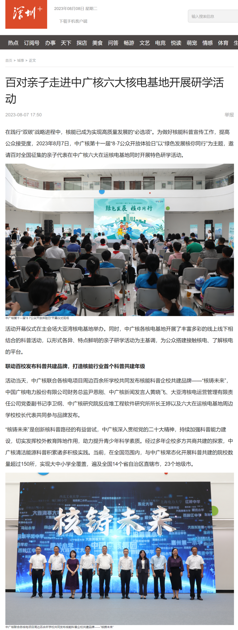 8月7日,中廣核第十一屆“8·7公眾開放體驗日”以“綠色發展 核你同行”為主題,邀請百對全國征集的親子代表,在中廣核六大在運核電基地開展特色研學活動。活動開幕儀式在主會場大亞灣核電基地舉行。與此同時,中廣核各核電基地開展了豐富多彩的線上線下相結合的科普活動,為公眾搭建接觸核電了解核電的平臺,國務院國資委官方微博、中國科學技術協會官網刊發相關報道,人民日報、光明日報、經濟日報、中新社等20余家主流媒體對此進行了聚焦報道。