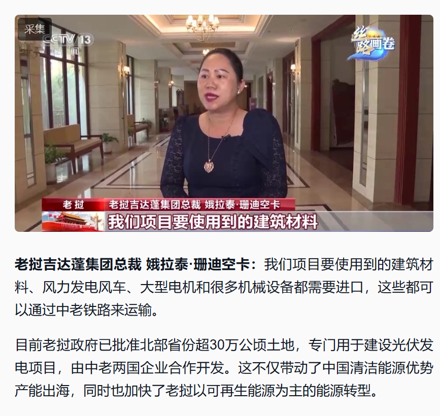 老撾吉達(dá)蓬集團總裁 娥拉泰·珊迪空卡:我們項目要使用到的建筑材料、風(fēng)力發(fā)電風(fēng)車、大型電機和很多機械設(shè)備都需要進口,這些都可以通過中老鐵路來運輸。